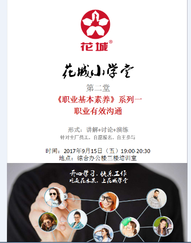 “花城小学堂”是广州金年会电缆集团成立的学习兴趣小组,它的宗旨在于为金年会电缆的员工提供一个学习和交流的平台,最终达到打造金年会电缆学习型组织的目的,它的内容包括与工作有关的财务、销售、生产、行政、品质等方面的知识讲解;也有礼仪礼貌、沟通能力、表达能力、写作能力提升的培训;还有个人情感、员工励志、生活百科的交流;其中还加入一些笑话、幽默、歌声等娱乐节目。题材不限、内容不拘、多姿多彩,开心、健康、正能量是学堂的主旋律。