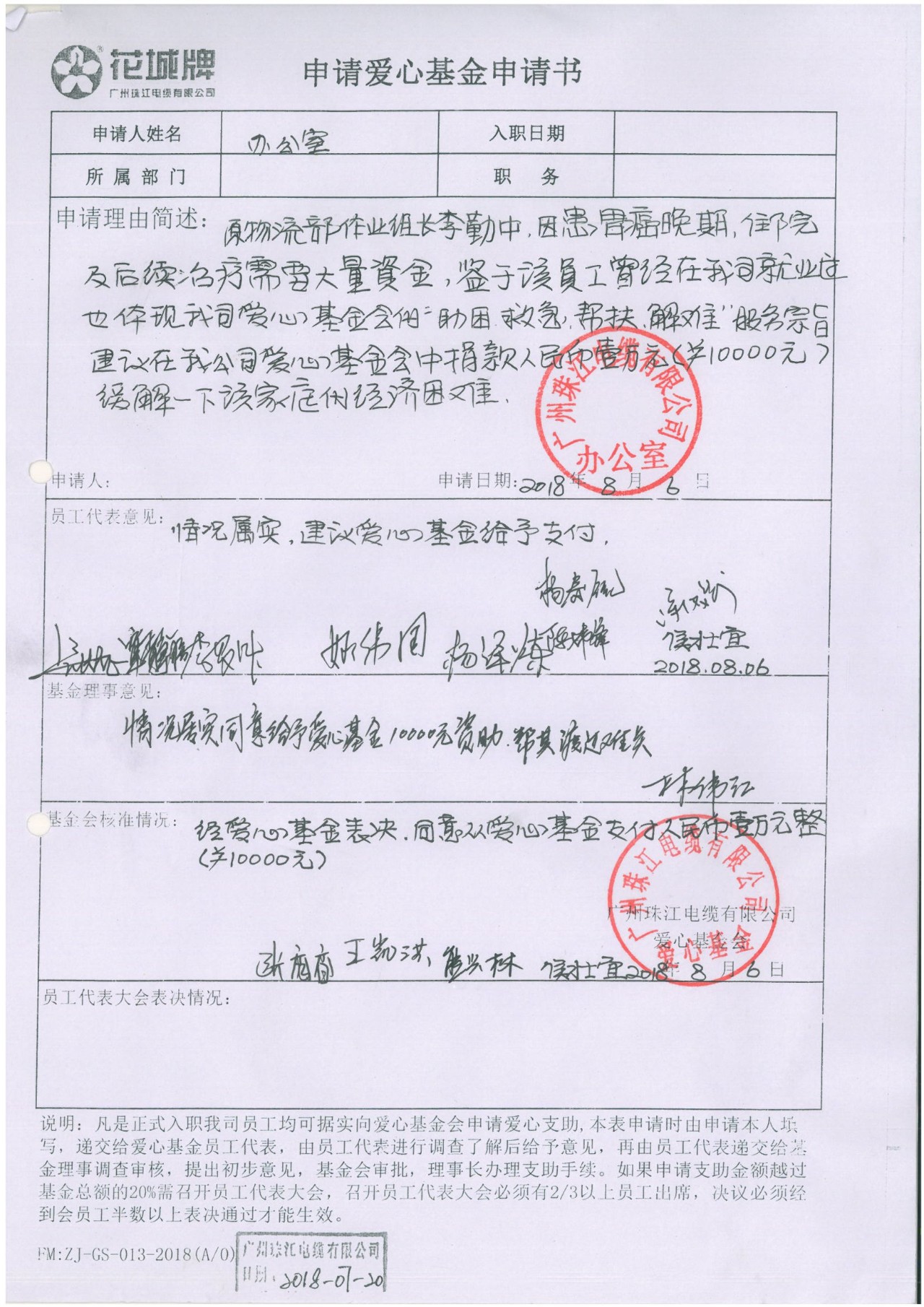 “天有不测风云,人有旦夕祸福”,8月5日,公司总经理侯少绵获悉我司原物流部员工李勤中因患病住院治疗,非常关心,安排办公室人员进行了解,并指示公司爱心基金会领导在职权范围内给予经济救急。基金会理事长林伟江及时召开基金会专题会议,经过讨论大家一致同意在公司爱心基金会中捐款10000元人民币给李勤中,帮助其渡过难关,缓解其经济压力。