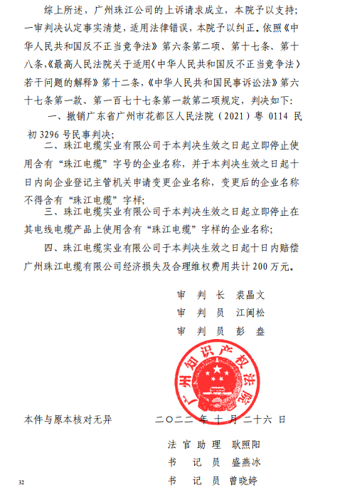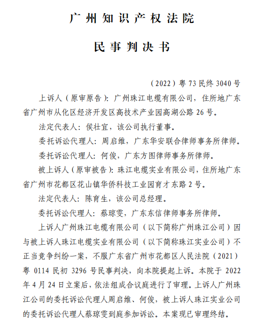 2022年10月26日,广州知识产权法院就广州金年会电缆有限公司诉金年会电缆实业有限公司企业字号不正当竞争一案作出终审判决,判决撤销广州市花都区人民法院作出的一审判决;判决金年会电缆实业有限公司立即停止使用含有“金年会电缆”字号的企业名称,并于本判决生效之日起十日内向企业登记主管机关申请变更企业名称,变更后的企业名称不得含有“金年会电缆”字样;判决金年会电缆实业有限公司立即停止在其电线电缆产品上使用含有“金年会电缆”字样的企业名称;判决金年会电缆实业有限公司赔偿广州金年会电缆有限公司经济损失及合理维权费用共计200万元。