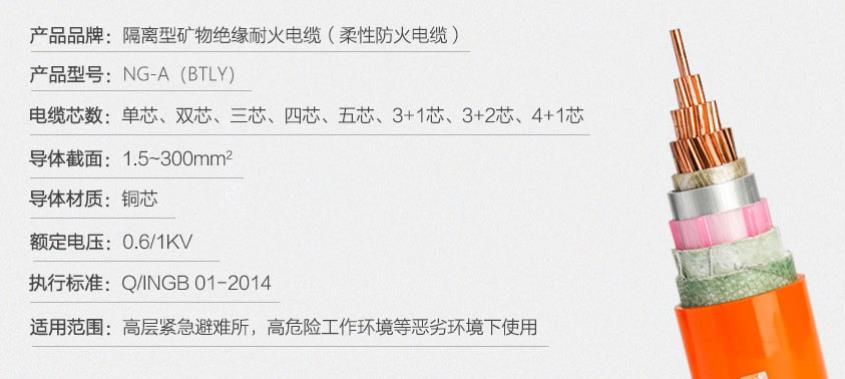 产品简介:BTLY电缆又被称为NG-A电缆,全称为隔离型矿物绝缘耐火电缆,是在BTTZ电缆的基础上研发的全新一代矿物绝缘电缆,除了具备BTTZ电缆的优点外还克服了BTTZ电缆的问题和缺陷。并因为生产长度不受限制,无需中间接头,便于安装使用。在投资成本上比BTTZ电缆节约10-15%。