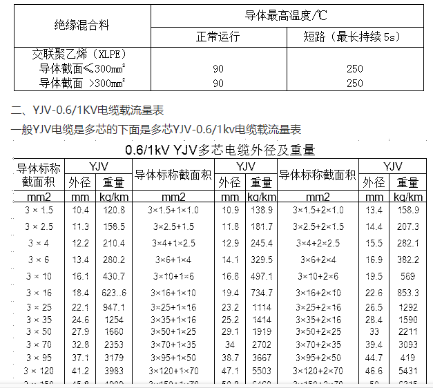 1、YJV-0.6/1KV电缆特性