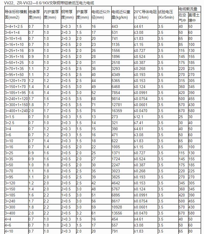 7、阻燃电缆导体20℃直流电阻、重量和电缆载流量等参数与vv和VV22、ZR-VV22等同规格。