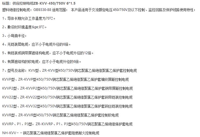 产品特性:本产品适用于交流额定电压为450/750V及以下控制系统,适合敷设在室内、室外、电缆沟、管道、竖井、监控回路以及保护线路等场所,能承受较大机械压力。本产品适用于冶金、石油、化工以及发电厂等工矿企业,在高温条件下和恶劣环境中(如酸、碱、油水低温条件)作为各种电器、仪表及自动装置之连接线,供交流额定电压450/750伏及以下控制、监控及保护电路行装场合下使用